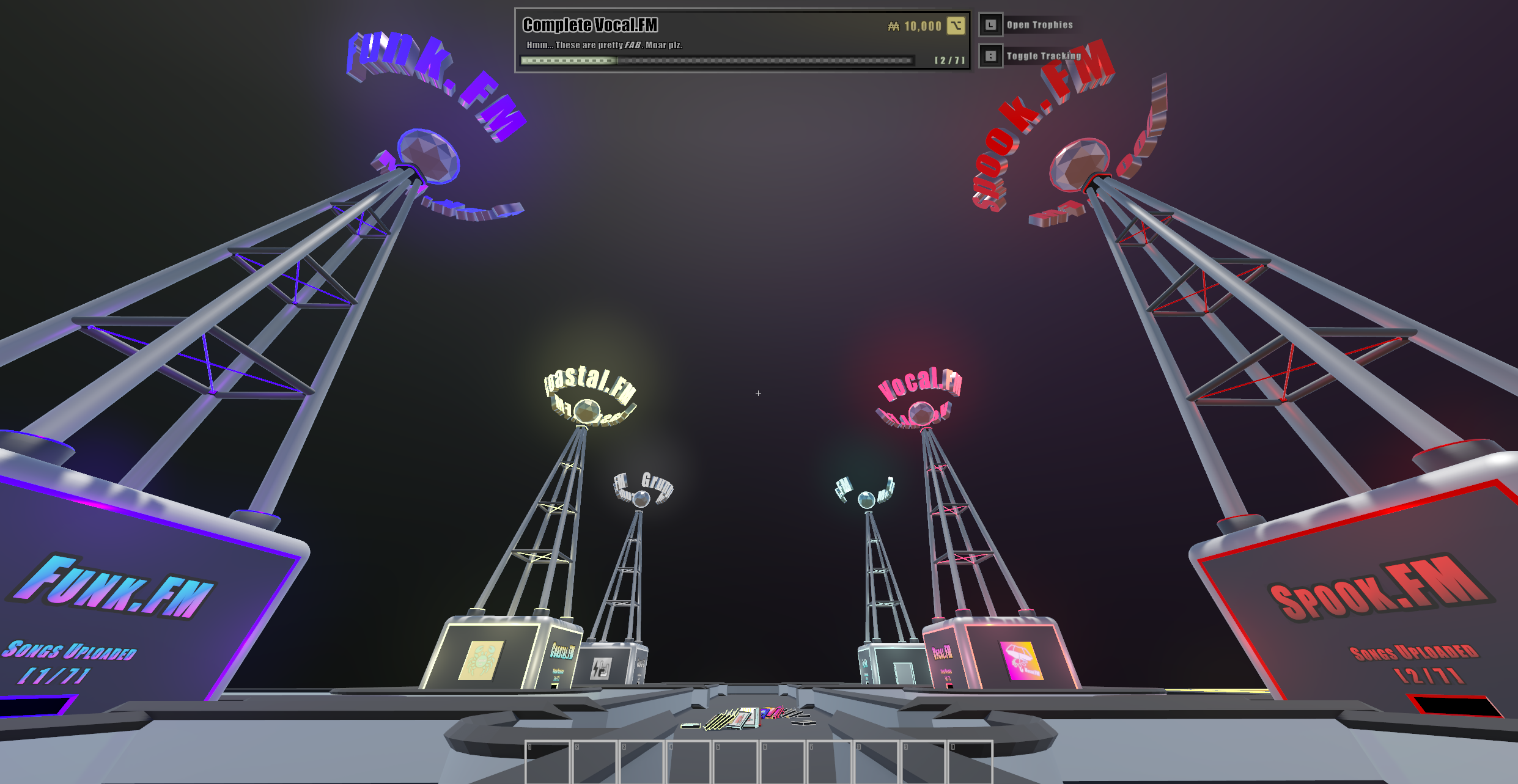 Come check out the world, find all the songs, spin for skins, unlock the radios, and customize your character- All wrapped up in a friendly physics sandbox! The game's in early dev right now, but there's achievements and objectives, and more is coming quite soon. :D